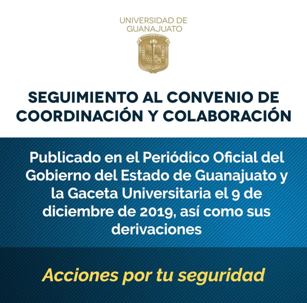 Este acceso tiene el objetivo de agilizar el proceso de comunicación acerca del seguimiento al Convenio de coordinación y colaboración publicado en el Periódico Oficial del Gobierno del Estado de Guanajuato y la Gaceta Universitaria el pasado 9 de diciembre del 2019, así como sus derivaciones.