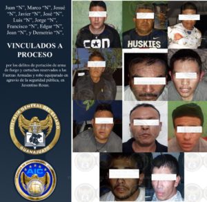 Juventino Rosas, Gto. 27 de enero de 2020.- Al finalizar la duplicidad del término legal previsto en la Constitución, la Fiscalía General del Estado obtuvo que 11 sujetos detenidos el pasado 17 de enero imputados por los delitos de portación de arma de fuego y cartuchos reservadas a las Fuerzas Armadas y robo equiparado en agravio de la seguridad pública, fueran vinculados a proceso y puestos en reclusión preventiva oficiosa.