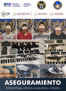 El capo criminal fue detenido junto con Kevin “N”, Francisco Saúl “N”, apodado Pocho y Martín “N” alias El Chirchillo, también integrantes de dicho grupo delictivo, a quienes se les aseguraron armas de fuego, cartuchos, ropa, chalecos tácticos, gorras, playeras con insignias del grupo criminal y diversas dosis de hierba verde, al parecer mariguana, dos motocicletas con reporte de robo en los municipios de Villagrán y Cortazar.