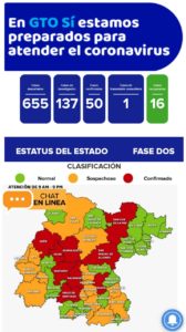 La página oficial de la Secretaria de Salud del Estado de Guanajuato, informó que, hasta esta tarde, se tienen registrados 50 casos confirmados de coronavirus en el estado, así como 137 casos en investigación y 655 casos descartados.