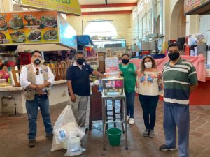 Los kits contienen cloro, jabón líquido, cubre bocas, guantes, termómetro, líquido sanitizante, etiquetas de sana distancia, etiqueta de frascos, entre otros elementos que son indispensables para poder llevar a cabo cualquier actividad económica de forma segura y a los cuales se ha sumado los lavabos portátiles con la intención de que las personas tengan un lugar donde poder lavarse las manos como lo establece la Secretaría de Salud.