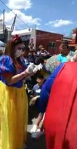 En una transmisión en vivo realizada en el perfil de Facebook de Gero Yebra, , también promotor deportivo y de iniciativas humanitarias, se pudo observar a la regidora Virgina Hernández Marín disfrazada de la princesa Blanca Nieves, repartiendo bolsas de dulces.