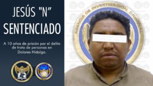 Dolores Hidalgo, Gto. La Fiscalía General del Estado ha obtenido sentencia condenatoria de 10 años de prisión, mediante un procedimiento abreviado en contra de Jesús “N”, quien se declaró culpable del cargo criminal que el agente especializado del Ministerio Público le imputó por el delito de trata de personas en agravio de una víctima menor de edad.