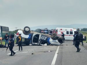 La patrulla quedó atravesada en la carretera, los cuerpos del personal quedaron tendidos a varios metros donde quedó volcada la unidad.
