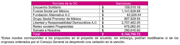 El Consejo General del Instituto Nacional Electoral (INE) aprobó sanciones por las irregularidades encontradas en la revisión de los informes mensuales de Ingresos y Egresos de las Organizaciones de Ciudadanos que presentaron solicitud formal para obtener su registro como partido político nacional, por un monto global preliminar de 6.14 millones de pesos.