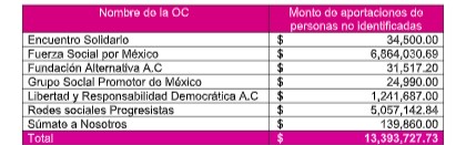 En la fiscalización realizada por el INE, la autoridad electoral encontró en los registros contables de todas las organizaciones aportaciones por parte de personas no identificadas por un total de 13.3 millones de pesos.