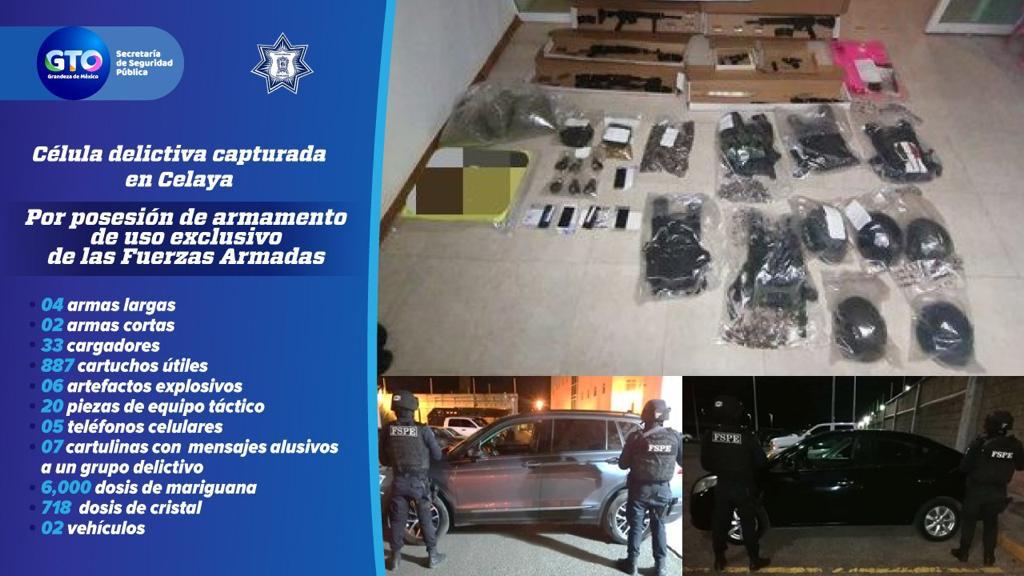 Durante la detención de estas personas, se les aseguró una gran cantidad de armas de fuego, cargadores, municiones, artefactos explosivos de fabricación artesanal, equipo táctico, armas blancas, vehículos, miles de dosis de diversas drogas y varias cartulinas alusivas a un grupo criminal.