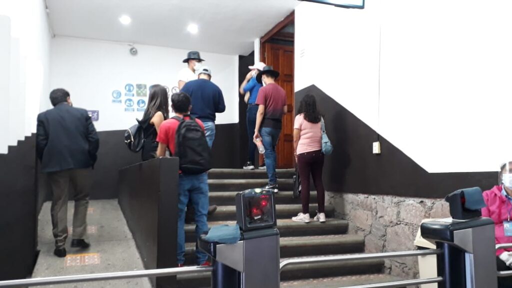 En el acceso al museo personal de la Presidencia Municipal de Guanajuato toma la temperatura de las y los visitantes, les aplica gel antibacterial y se asegura de que porten cubrebocas. Después pasan por un arco y tapetes sanitizantes y se colocan en grupos de ocho personas en el pasillo de ingreso al museo.