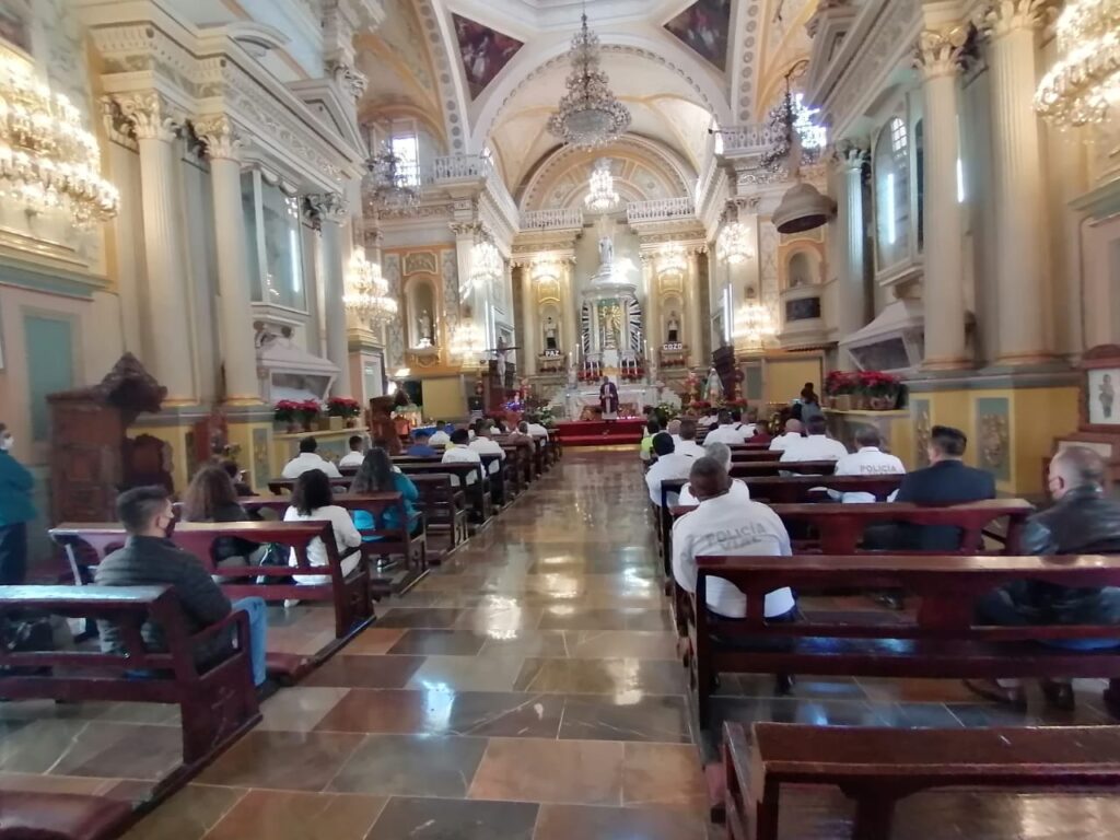 Los agentes viales, escucharon la misa oficiada por el padre Rubén de la Cruz Martínez, quien también reconoció su labor y recordó a los elementos que este año han perdido la vida, uno por un infarto y otro víctima del covid.