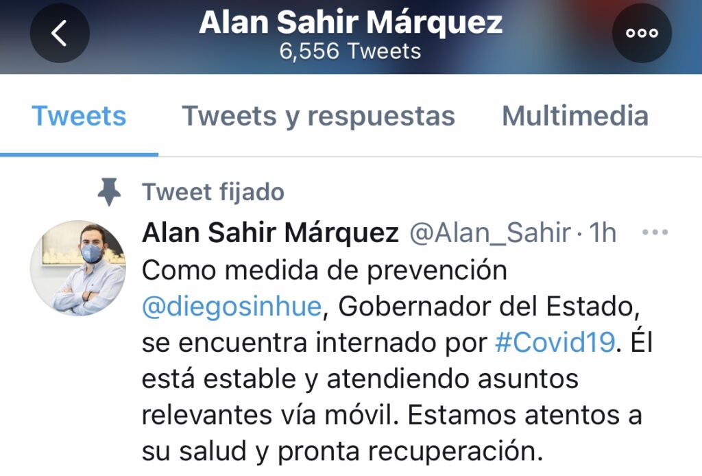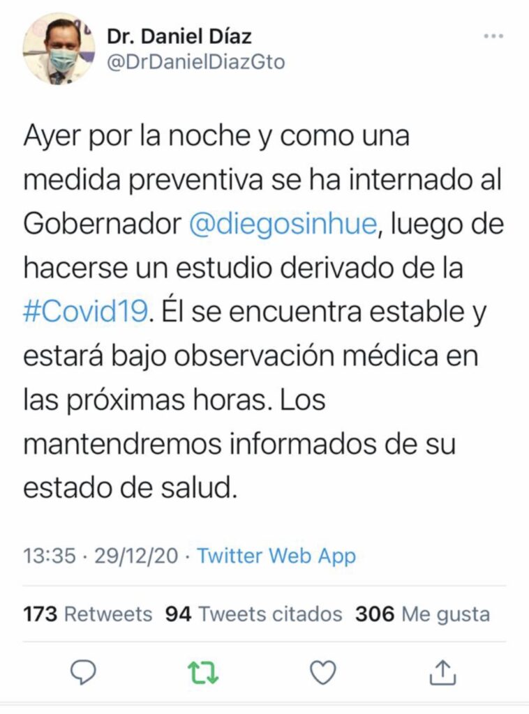 A través de su cuenta de twitter, el secretario citó textual, “Ayer por la noche y como una medida preventiva se hay internado al Gobernador Diego Sinhue, luego de hacerse un estudio de rivado de la #Covid19.
