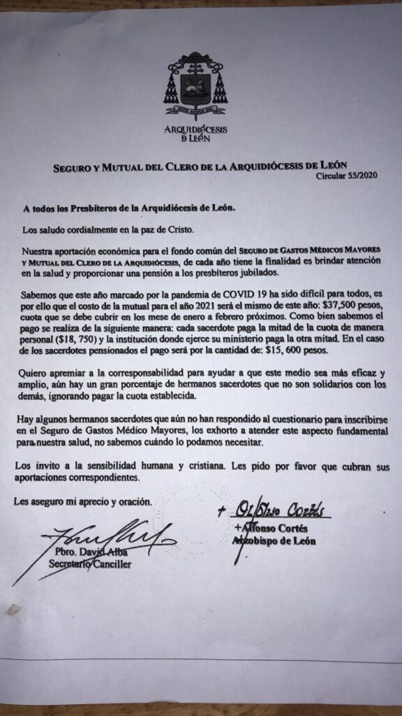 Para atender los temas de la salud de los religiosos, existe el denominado Seguro y Mutual del Clero de la Arquidiócesis de León, por el que cada padre paga de manera anual, 37 mil 500 pesos, para atenderse en el Hospital Pablo de Anda, “o donde haya un médico que también está en colaboración de la Mutual y le llamamos a nuestro seguro y el sacerdote busca dónde está ese médico especialista que es parte de este programa”.