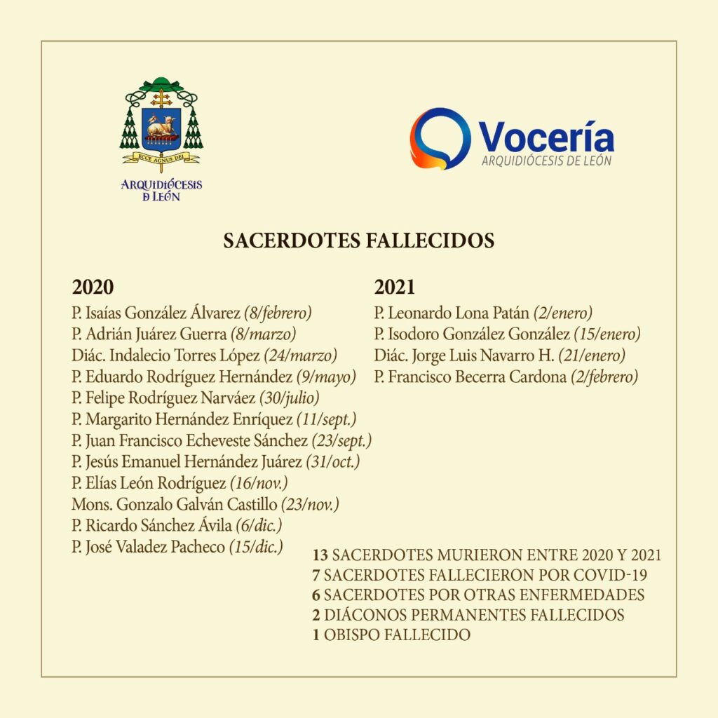 Guanajuato, Gto. –Del año pasado a la fecha, la Arquidiócesis de León, ha registrado un total de 16 fallecidos, entre sacerdotes, diáconos y Monseñor Gonzalo Galván Castillo, Obispo Emérito de la Diócesis de Autlán, Jalisco, pero ordenado sacerdote en León; 7 han muerto a causa del coronavirus y el resto por otras causas, informó el vocero, Marcos Cortés Muñiz.
