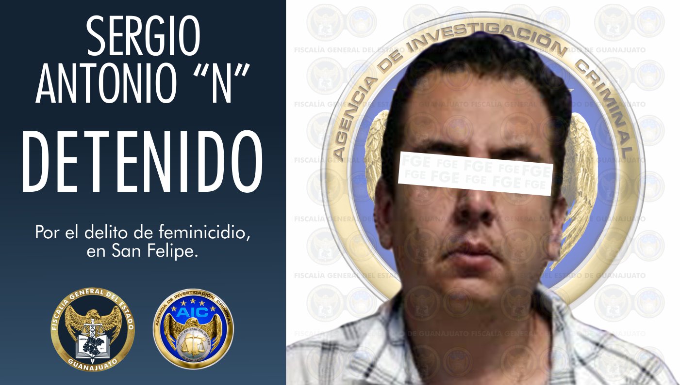 San Felipe, Gto. Como resultado del trabajo de investigación, la Fiscalía General del Estado (FGE) esclarece el feminicidio de la joven Guadalupe “N”, y con orden de aprehensión durante un despliegue operativo de Agentes de Investigación Criminal (AIC), se logra la detención de la pareja sentimental de la víctima, SERGIO ANTONIO “N”, como probable inculpado en el atroz crimen.