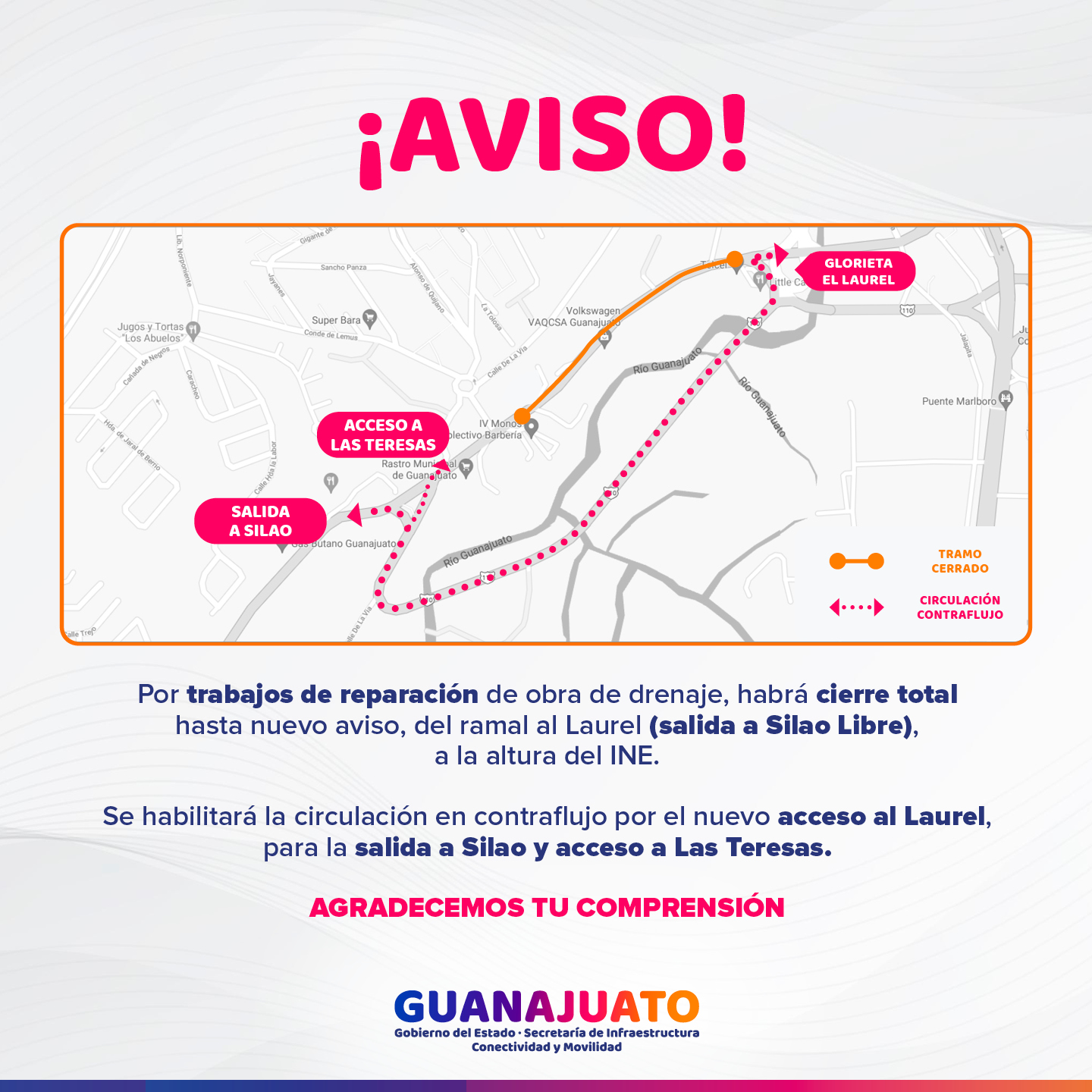 Durante los próximos días se trabajará durante el día y la noche, para reparar la zona afectada, con el objetivo de que los usuarios pueden transitar con completa seguridad vial. Como vía alterna para la salida a Silao y acceso a Las Teresas, se habilitó la circulación a automóviles y transporte urbano, en contraflujo, por el nuevo acceso al Laurel.