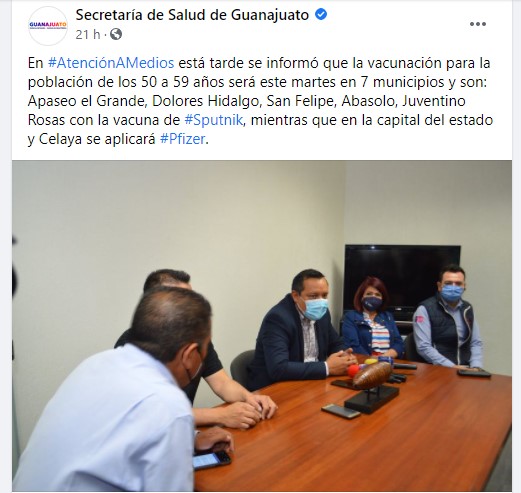 En la cuenta de Facebook de la secretaría de Salud de Guanajuato se anota «En #AtenciónAMedios está tarde se informó que la vacunación para la población de los 50 a 59 años será este martes en 7 municipios y son: Apaseo el Grande, Dolores Hidalgo, San Felipe, Abasolo, Juventino Rosas con la vacuna de #Sputnik, mientras que en la capital del estado y Celaya se aplicará #Pfizer» publicó la secretaría de Salud a través de sus redes sociales.