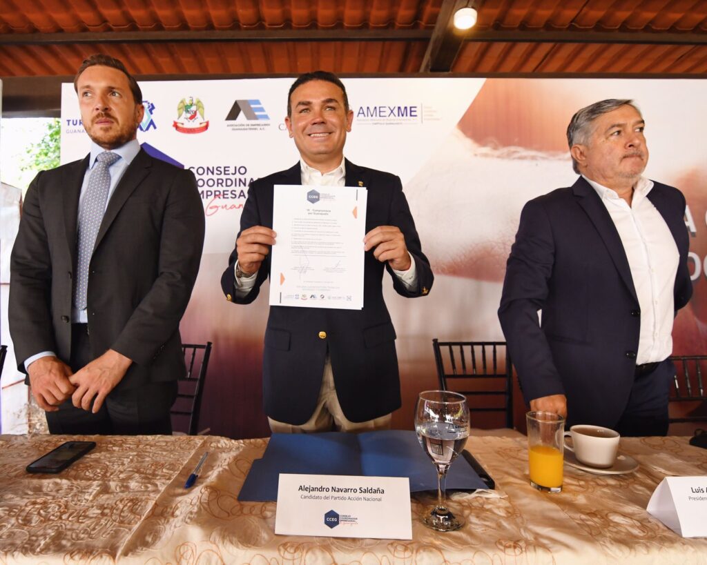La firma de los 10 compromisos fue suscrita por el candidato del PAN Alejandro Navarro Saldaña; Edgar Castro Cerrillo, candidato de la coalición Va x Guanajuato; Cristian Ortiz, de Movimiento Ciudadano; la aspirante Maribel Tovar, de Nueva Alianza, así como por Olga Fabiola Durán Torres del Partido del Trabajo; Daphne García Galván, de Redes Sociales Progresistas y también Carmen Cano Canchola, de Morena.