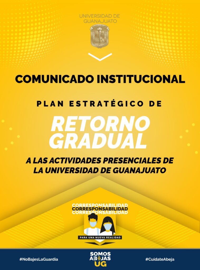 Ante cualquier situación extraordinaria que se presente, la Máxima casa de estudios, modificará el plan y será comunicado de forma expedita. Para el seguimiento del Plan estratégico de retorno podrá consultarse el micrositio: www.ugto.mx/retornograduaL, el cual se mantendrá en constante actualización durante esta etapa.