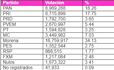 Ante los miembros del Consejo General, el Secretario Ejecutivo, Edmundo Jacobo Molina, presentó los resultados de los cómputos de circunscripción plurinominal correspondientes a la elección de diputaciones federales por el principio de Representación Proporcional que son los siguientes:
