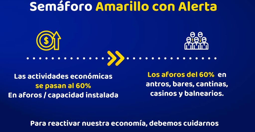 El subsecretario para Desarrollo de las micro, pequeñas y medianas empresas, dijo que del 23 al 29 de agosto funcionará el semáforo ‘Amarillo con alerta’, lo que significa que en materia económica todos los establecimientos tendrán que reducir su capacidad de atención o de aforos al 60 por ciento.