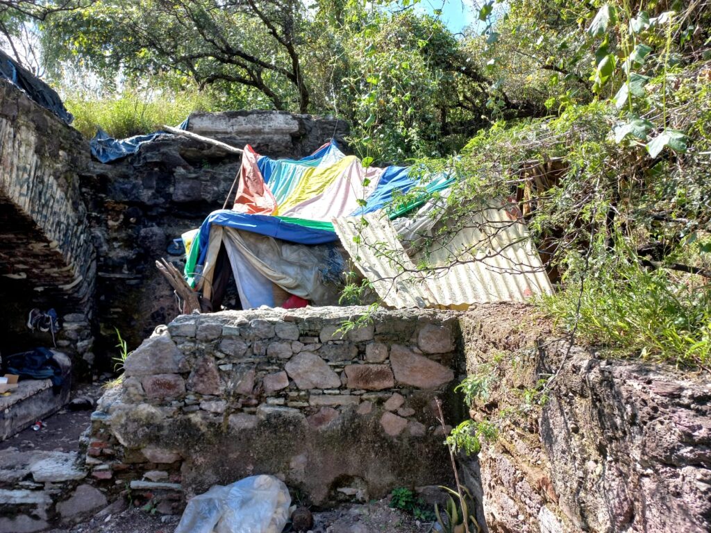Al seguirlo, encontraron un jacal construido con plástico, cobijas y láminas, adentro había dos sillones, varios cambios de ropa, indicios de fogatas, comida enlatada y calzado.