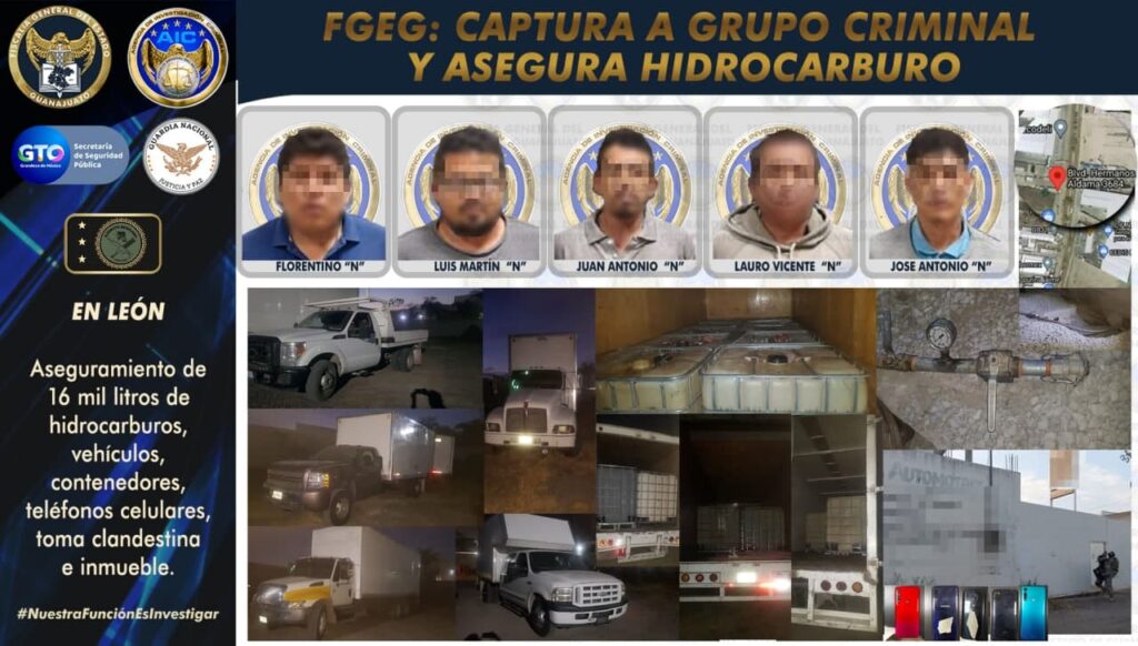 León, Gto. En uso de metodologías y herramientas científicas y tecnológicas aplicadas a la investigación del delito, la Fiscalía General del Estado a través de la Fiscalía Especializada en Investigación de Delitos de Alto Impacto intervino un inmueble localizado en la colonia La Pompa, en donde fueron detenidos cinco sujetos y se aseguraron cuatro tracto camiones, equipos de comunicación, una toma de combustible y 16 mil litros de gasolina.