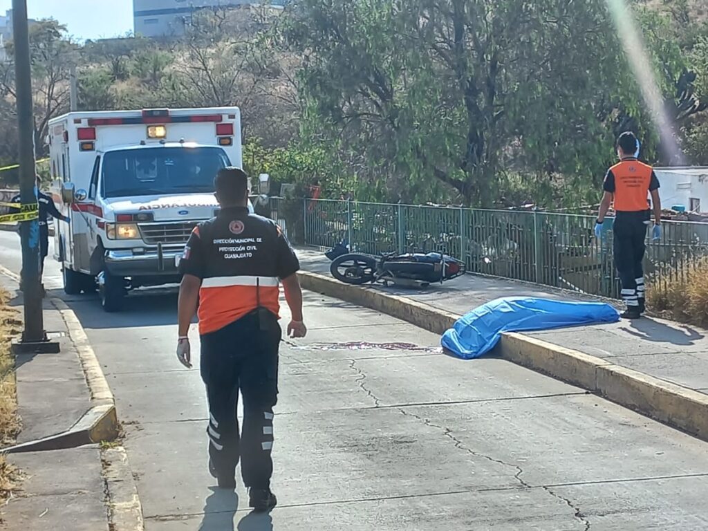 Guanajuato, Gto. Un menor de apenas 14 años falleció al derrapar la motocicleta que manejaba en el acceso Plaza de Toros-Las Teresas, en Guanajuato capital. El menor no llevaba puesto el casco y falleció al golpearse la cara contra el pavimento.
