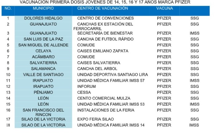 Guanajuato, Gto. Daniel Díaz Martínez, secretario de salud de Guanajuato, informó que se vacunarán con su primera dosis AntiCovid, de la marca Pfizer, a los jóvenes de 14, 15, 16 y 17 años.