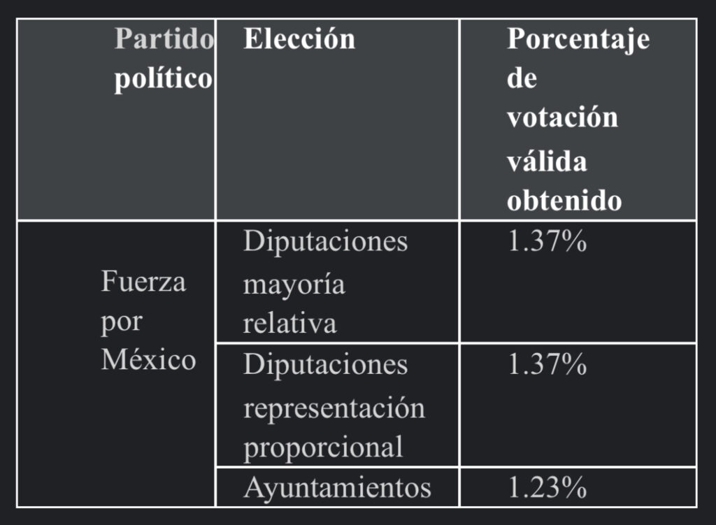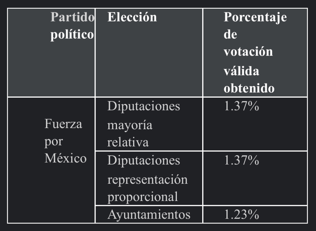 Como se aprecia en la tabla anterior, en ninguna de laselecciones celebradas en el PEL ordinario 2020-2021,el otrora partido político nacional Fuerza por México obtuvo al menos el tres por ciento de la votación válida emitida, lo que tornó inatendible la solicitud deregistro como partido político local.