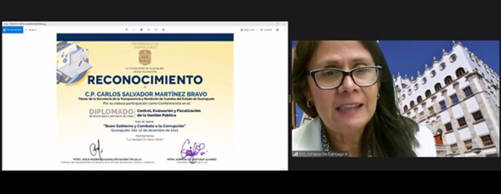 Guanajuato, Gto.- En el marco del Diplomado «Control, Evaluación y Fiscalización de la Gestión Pública», del Campus Digital de la Universidad de Guanajuato (UG), se impartió la conferencia conjunta «Buen Gobierno y combate a la corrupción» a cargo del Mtro. Carlos Salvador Martínez Bravo, Secretario de la Transparencia y Rendición de Cuentas del Estado de Guanajuato, y el maestro Jesús Rodrigo Guadalupe Nájera Trujillo, profesor del Departamento de Derecho de la UG.
