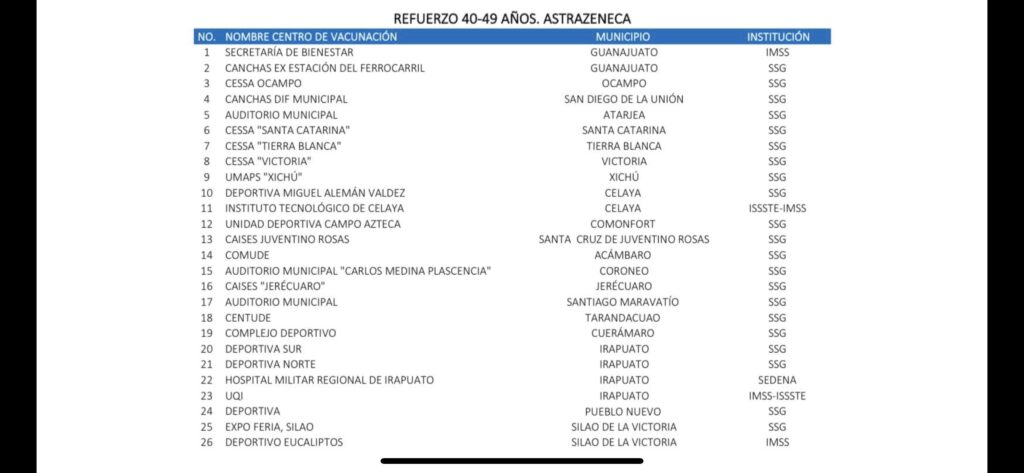 Se tratan de vacunas de la marca AstraZeneca, para los siguientes municipios: Guanajuato, Ocampo, San Diego de la Unión, Atarjea, Santa Catarina, Tierra Blanca, Victoria, Xichú, Celaya, Comonfort, Juventino Rosas, Acámbaro, Coroneo, Jerécuaro, Santiago Maravatío, Tarandacuao, Cuerámaro, Irapuato, Pueblo Nuevo y Silao. Son 26 puestos de vacunación en 20 municipios.