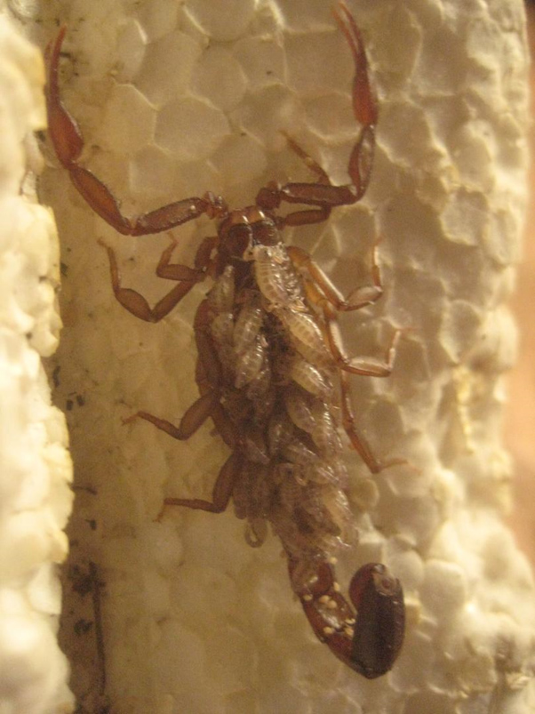 Una vez que ocurre la fertilización, los descendientes se desarrollan dentro de la madre. La gestación de los escorpiones puede ser de meses hasta un año, dependiendo de la especie. Valga aquí mencionar que se ha registrado en algunas especies el fenómeno de partenogénesis. Con el tiempo la madre da a luz a los pequeños que suben al lomo de la madre y ahí continúan desarrollándose y mudando de piel, hasta que llega el momento en que la dejan y comienzan su vida independiente.