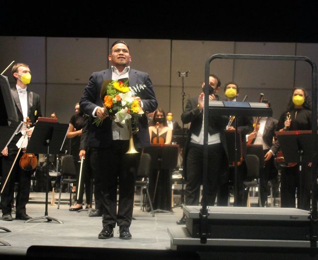 Desde muy pequeño, José Cayetano Hernández fue atrapado por la música. En las fiestas del pueblo, junto a los danzantes, en el atrio del templo, donde retumbaban los sonidos de trompetas, clarinetes, trombones y trompetas, nació su pasión por el arte musical; ahora es trompetista en la OSUG, donde apenas el 11 de marzo tocó como solista durante un concierto que será recordado por varias razones.