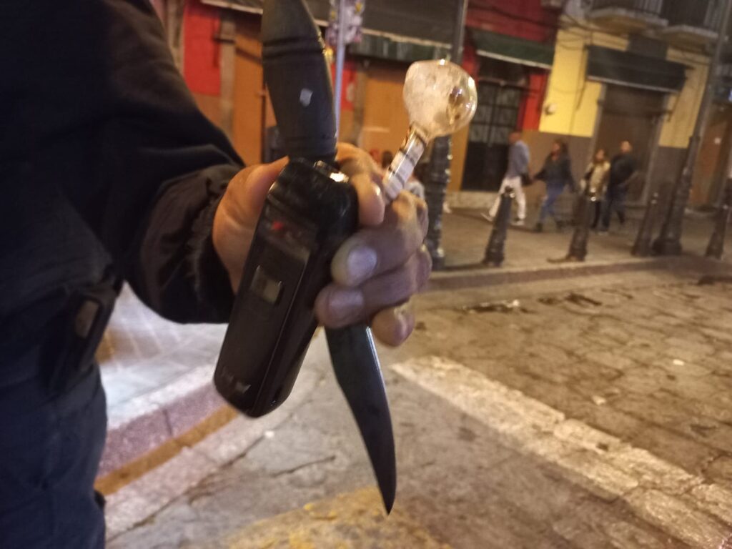 Adentro de la unidad, le encontraron un arma blanca, una pipa con residuos de la llamada droga cristal y un -tiser- que sirve para hacer descargas eléctricas, además a un costado del asiento del conductor traía un desarmador.