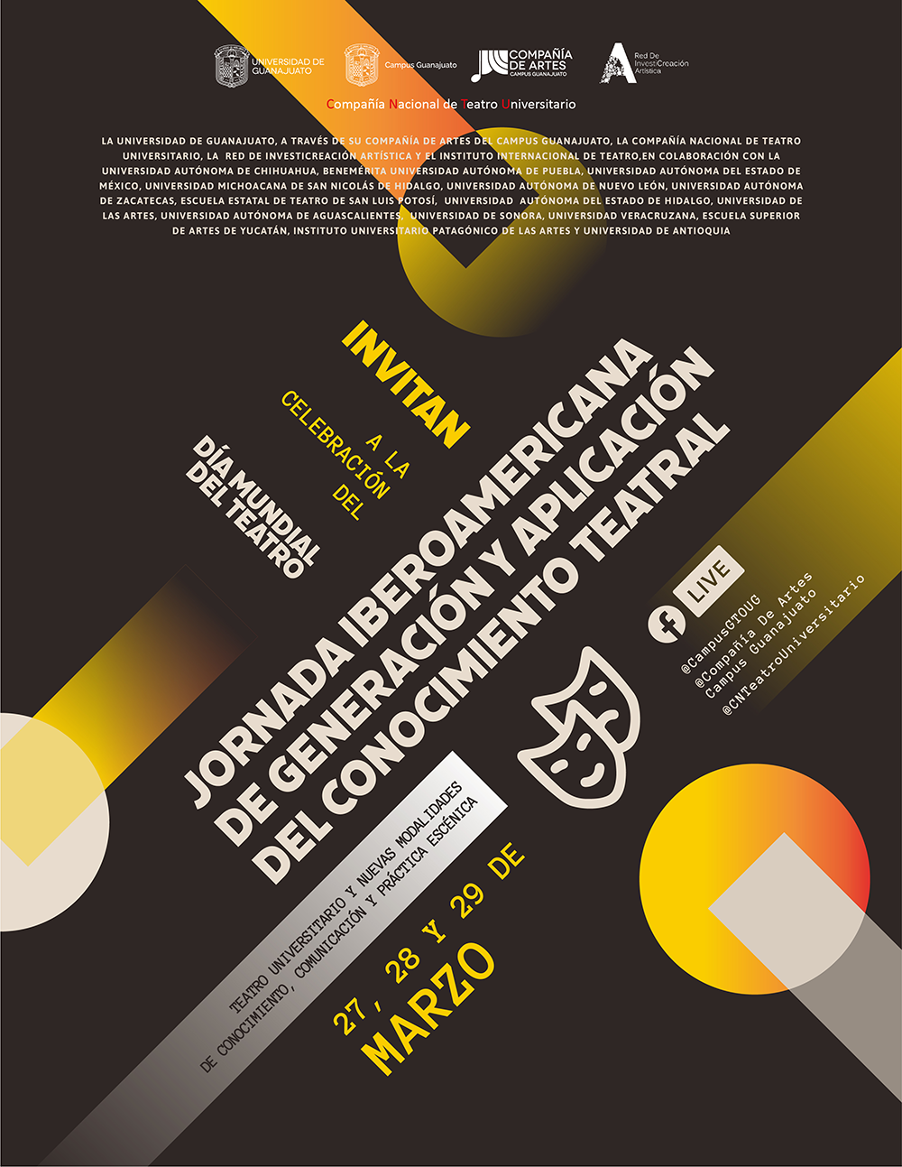 Dentro de la Celebración Día Mundial del Teatro, la Compañía de Artes del Campus Guanajuato en colaboración con la Compañía Nacional de Teatro Universitario, la Red Internacional de Investicreación Artística y diversas universidades nacionales e internacionales se invita a la «Jornada Iberoamericana de Generación y Aplicación del Conocimiento Teatral».
