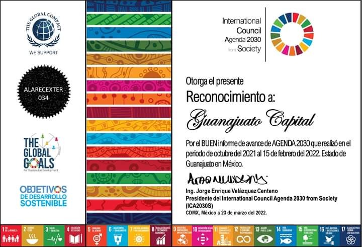 Guanajuato, Gto. Guanajuato capital ha avanzado en el cumplimiento de la Agenda 2030 de Desarrollo Sostenible, lo que le ganó el reconocimiento de la organización “International Council Agenda 2030 From Society”.