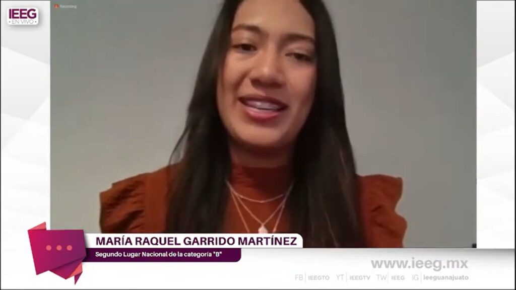 Guanajuato, Gto. El Instituto Electoral del Estado de Guanajuato, a través de la Comisión de Cultura Política y Electoral, reconoció a María Raquel Garrido Martínez por obtener el segundo lugar nacional del Concurso de Debate Intercultural y Colectivo Modalidad Virtual 2021.