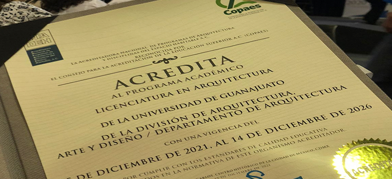 Guanajuato, Gto.- En el marco de la 106 reunión de la Asociación de Instituciones de la Enseñanza de la Arquitectura de la República Mexicana (ASINEA) celebrada en el Tecnológico de Monterrey, el Departamento de Arquitectura de la Universidad de Guanajuato (UG), recibió de la Acreditadora Nacional de Programas de Arquitectura y Disciplinas del Espacio Habitable (ANPADEH) la constancia de Acreditación de su programa de licenciatura, para el periodo 15 de diciembre del 2021 al 14 de diciembre del 2026.