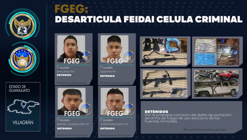Celaya, Gto. En una intervención avalada por la autoridad judicial, la Fiscalía General del Estado, a través de la Fiscalía Especializada en Investigación de Delitos de Alto Impacto (FEIDAI), desarticuló una célula criminal que operaba en la zona Laja-Bajío y que tenía como punto de reunión la localidad de los Ángeles del municipio de Villagrán, en donde planeaban delitos como homicidio, secuestro, extorsión, robo de autotransporte, robo de vehículo y delitos contra la salud.