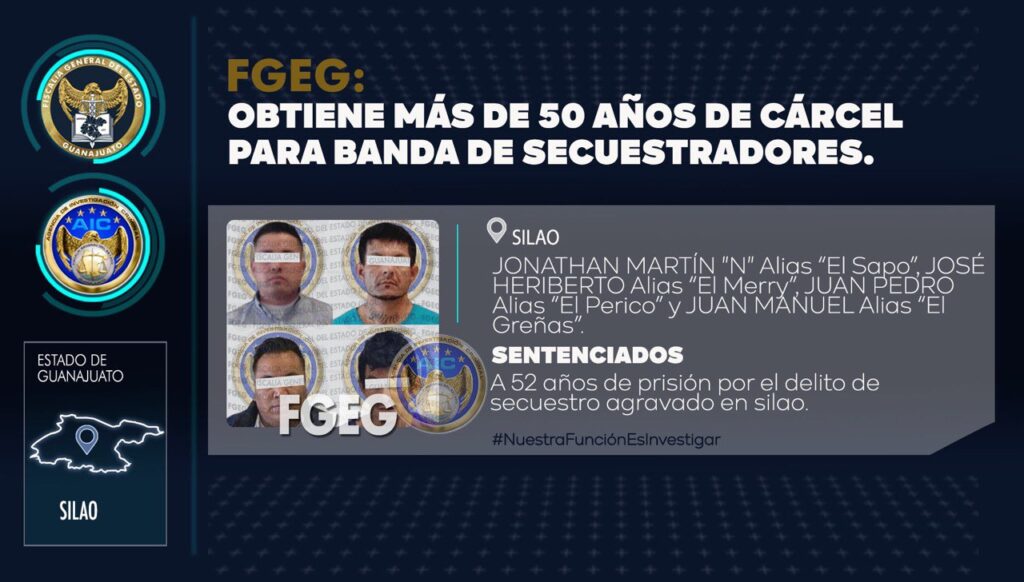 Silao, Gto. Derivado de una investigación de la Unidad Especializada en Combate al Secuestro, una banda de plagiadores fue sometida a un duro castigo, consistente a cincuenta y dos años de cárcel, por haber secuestrado a un comerciante en la zona centro de Silao, en 2020.