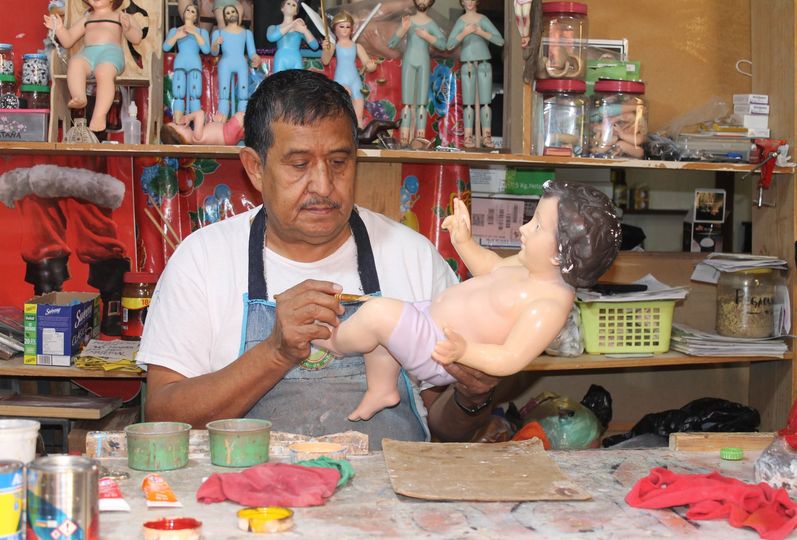 Las representaciones desquebrajadas de Reyes Magos, santos y diversas vírgenes llegan ahí, y al paso de varios días o semanas, salen con un aspecto diferente; herramientas fundamentales son la imaginación y la paciencia, no tan solo para reconstruir sino para crear algo nuevo, como cuando a esas manos sensitivas llega la figura rota de algún Niño Dios, entonces, don Vicente se transporta a la época en que era niño y le gustaban las “posadas”, es cuando más se desata su capacidad creadora y trabaja hasta ver su obra concluida.