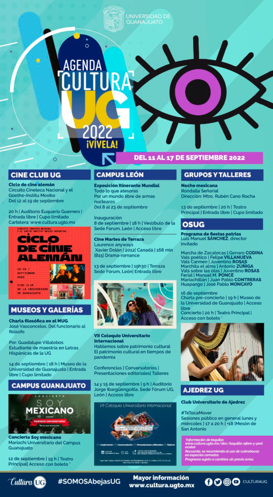 Guanajuato, Gto.- La cartelera cultural de la Universidad de Guanajuato (UG) tiene para todo público presentaciones cinematográficas, conciertos musicales y diversas actividades académicas en el marco de las Fiestas Patrias, que pueden conocerse a través de https://www.cultura.ugto.mx/