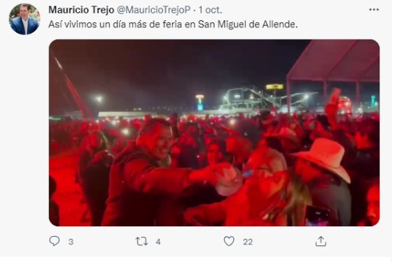 Lo anterior en referencia a los videos que circulan en redes sociales sobre el alcalde de San Miguel de Allende, Mauricio Trejo, quien en la inauguración de la feria del municipio pasó con una botella de alcohol a dar ‘shots’ a las personas que estaban en el concierto de la noche del primero de octubre.