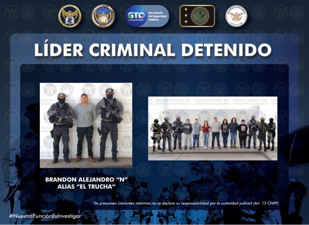 Guanajuato, Gto. En una intervención con sustento en información de inteligencia, la Fiscalía General del Estado coordinó acciones con el Ejército Mexicano, Guardia Nacional y la Secretaría de Seguridad Pública del Estado, con lo cual se logró la detención de BRANDON ALEJANDRO “N”, un sujeto de 26 años, apodado “El Trucha” y a seis personas más.