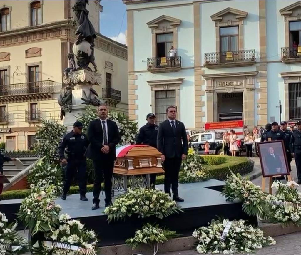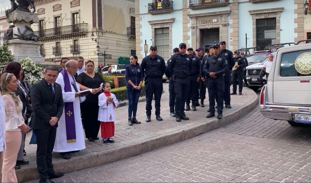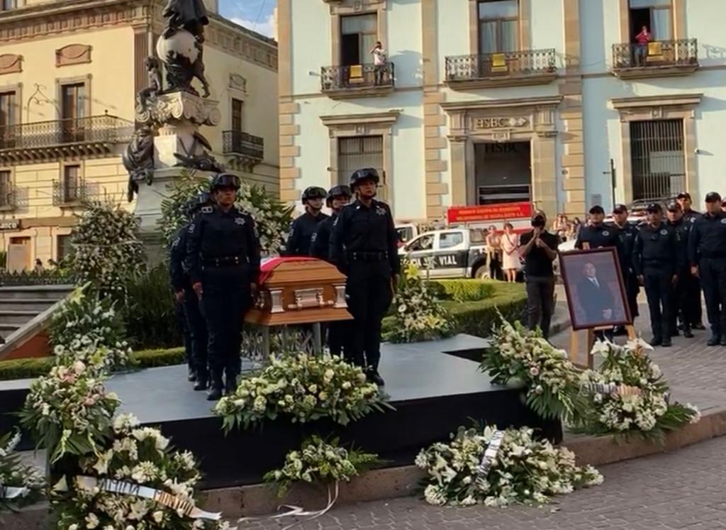 Guanajuato, Gto. En la plaza de la Paz, enfrente de la entrada de la Basílica Colegiata de nuestra señora de Guanajuato, el ayuntamiento capitalino, familiares y amigos despidieron con honores a Alejandro Camacho Escobar, subsecretario Operativo de Seguridad Ciudadana, asesinado el miércoles en la entrada del Maluco a unos dos mil metros lineales del Cereso de Puentecillas.