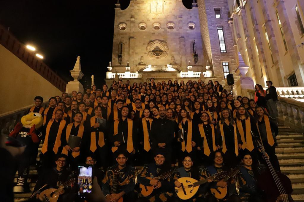 Guanajuato, Gto.- En las escalinatas del Edificio Central de la Universidad de Guanajuato (UG) tuvo lugar el arranque de la Universiada Cervantina 2023 con la participación del Coro Monumental UG, ensamble que agrupó a cantantes, profesionales de la voz así como a estudiantes del nivel medio superior y nivel superior de diversos puntos de la entidad.