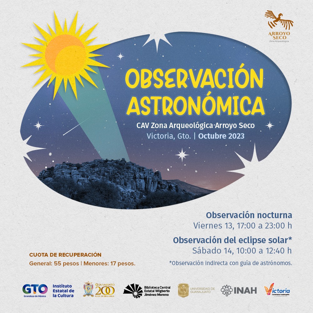 La Dra. Elcia Margareth Souza Brito, profesora e investigadora de la División de Ingenierías (DI) del Campus Guanajuato y la doctorando en Astrofísica, Martha Margarita López Gutiérrez, en colaboración con el Instituto Estatal de Cultura (IEC), la Biblioteca Central Estatal Wigberto Jiménez Moreno y el Centro INAH Guanajuato, invitan a acudir a las observaciones astronómicas en la zona arqueológica de Arroyo Seco, en el en municipio de Victoria, a realizarse el viernes 13 de 17:00 a 23:00 horas y el sábado de 9:00 a 12:40 horas.