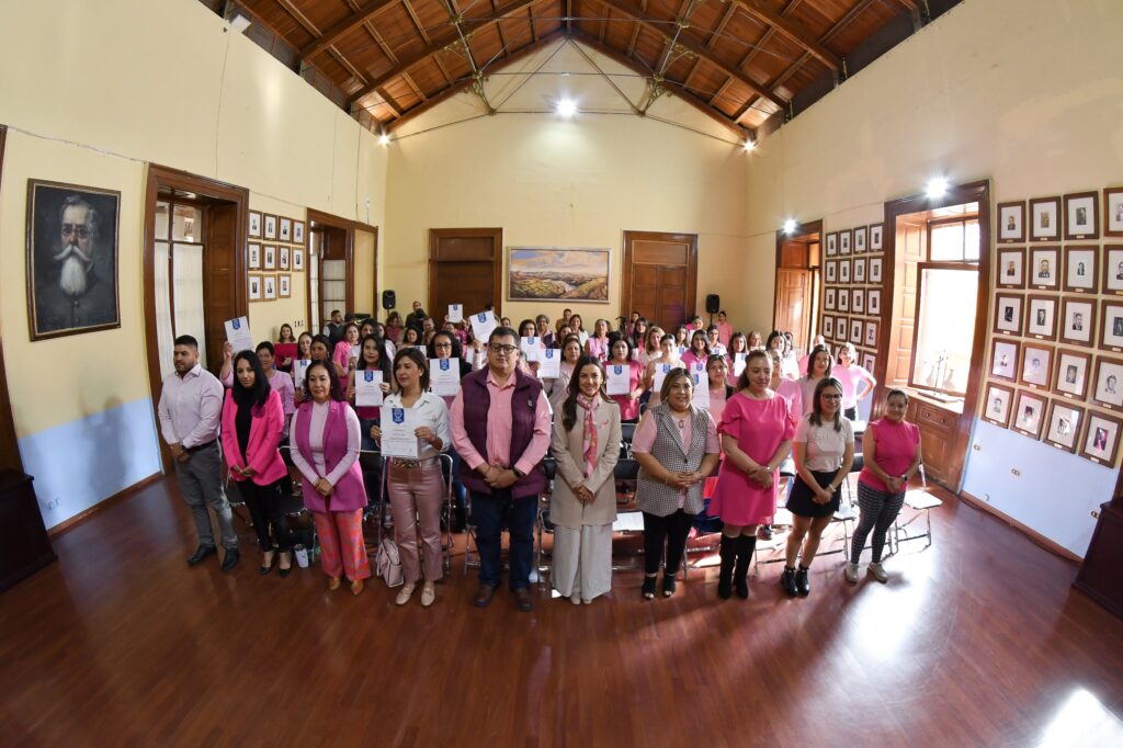 Guanajuato, Gto. Como parte de la conmemoración del día internacional contra el cáncer de mama, la administración capitalina entregó el distintivo Rosa a 52 trabajadoras del gobierno municipal.
