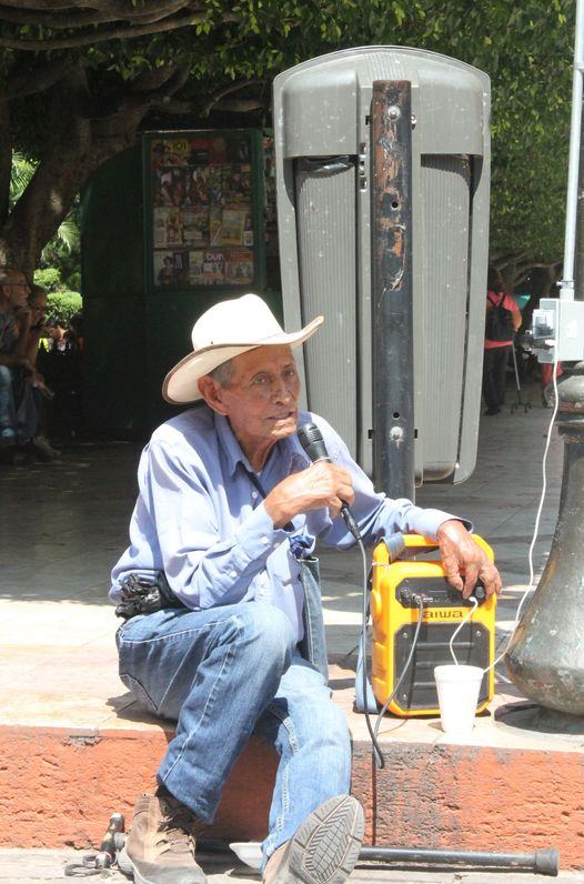A lo lejos apenas se oye algo muy nostálgico : “extraño tu suelo y cifro mi anhelo por volverte a ver..”, es la voz de don Juan, el de La Sauceda, que recorre las calles de Guanajuato con un micrófono y una bocina; se detiene, para sentarse casi frente al Teatro Juárez, no le importa estar junto a un depósito de basura, sigue cantando eso que seguramente le llega al corazón.