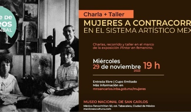 CDMX.- En el marco de la Noche de Museos, el Instituto Nacional de Bellas Artes y Literatura (Inbal) y el Museo Nacional de San Carlos (MNSC) realizarán la charla-taller Mujeres a contracorriente en el sistema artístico mexicano, en el cual abordarán el papel histórico, estético y la trascendencia de artistas mexicanas del siglo XIX y la primera mitad del XX, como parte de las actividades paralelas a la exposición Pintar en femenino. Mujeres en el sistema artístico mexicano 1846–1940. Homenaje a Leonor Cortina.
