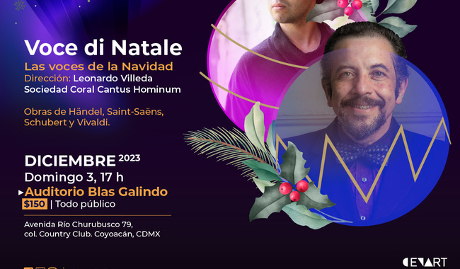 El domingo 3, a las 17:00 horas, en el Auditorio Blas Galindo, la Sociedad Cantoral Cantus Hominum, bajo la dirección de Leonardo Villeda, ofrecerá el concierto Voce di Natale. Las voces de la Navidad, que encenderá las luces navideñas con música de Häendel, Saint-Saëns, Schubert y Vivaldi, entre otros. Los boletos tienen un costo de $150 pesos.